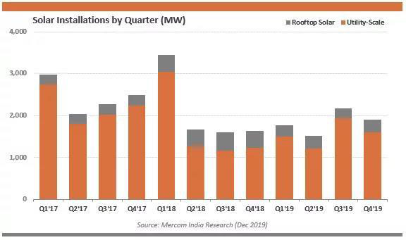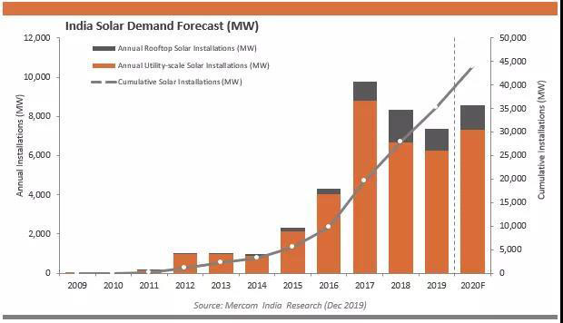 根據(jù)Mercom資本印度子公司統(tǒng)計(jì)數(shù)據(jù)顯示,2019年印度新增太陽(yáng)能裝機(jī)容量7.3吉瓦,同比下降12%,這讓其原本就讓人擔(dān)憂無(wú)法實(shí)現(xiàn)的100吉瓦太陽(yáng)能安裝目標(biāo)變得更加艱難。