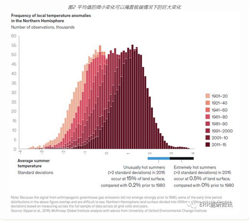 平均值掩蓋了極端情況下更為顯著的變化。在統(tǒng)計方面,溫度的分布正向右移動(向暖化方向)并逐漸變寬。這意味著許多地方的平均日數(shù)現(xiàn)在更熱了(“變化的方式”),極熱的日數(shù)變得更可能(“肥尾巴”)。例如,北半球每100×100平方公里觀測到的夏季平均溫度分布的演變表明,夏季平均溫度隨著時間的推移而增加。北半球(以平方公里為單位)經(jīng)歷了一個相當(dāng)炎熱的夏天的百分比增加了15倍(從不足1%增至15%),即一年中平均氣溫升高兩個標(biāo)準(zhǔn)差。北半球(以平方公里為單位)經(jīng)歷了一個酷熱的夏天,在一個特定的夏天,三個標(biāo)準(zhǔn)差更熱的平均溫度所占的比例從零上升至0.5%。
