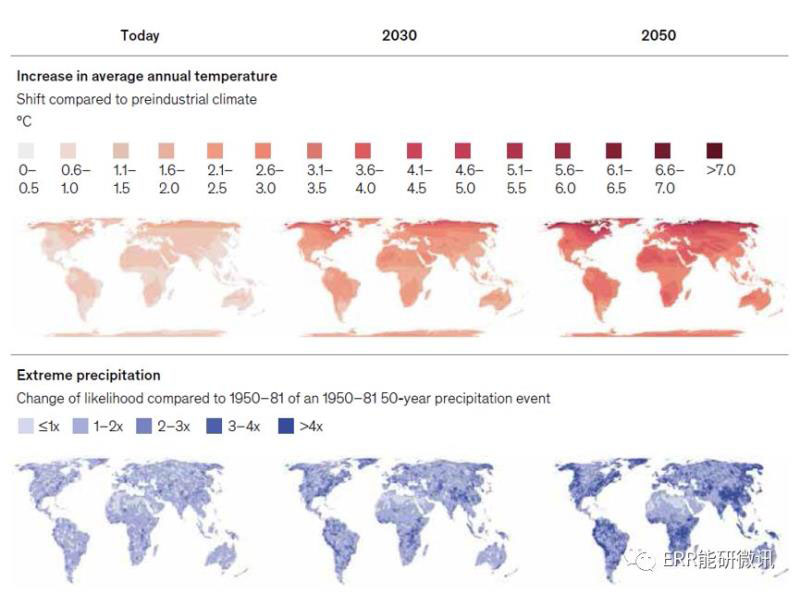 我們關(guān)注的是有形風(fēng)險,即氣候變化的有形影響所產(chǎn)生的風(fēng)險,包括對人、社區(qū)、自然和有形資本以及經(jīng)濟活動的潛在影響,以及對公司、政府、金融機構(gòu)和個人的影響。物理風(fēng)險是其他氣候風(fēng)險類型(轉(zhuǎn)型風(fēng)險和責(zé)任風(fēng)險)的基本驅(qū)動力。我們不關(guān)注轉(zhuǎn)型風(fēng)險,即脫碳影響或與氣候變化相關(guān)的責(zé)任風(fēng)險。雖然對脫碳及其帶來的風(fēng)險和機遇的理解是一個關(guān)鍵的話題,但本報告通過探討在未脫碳的情況下,未來1~30年持續(xù)的氣候變化的性質(zhì)和代價做出了貢獻。