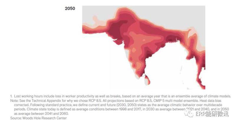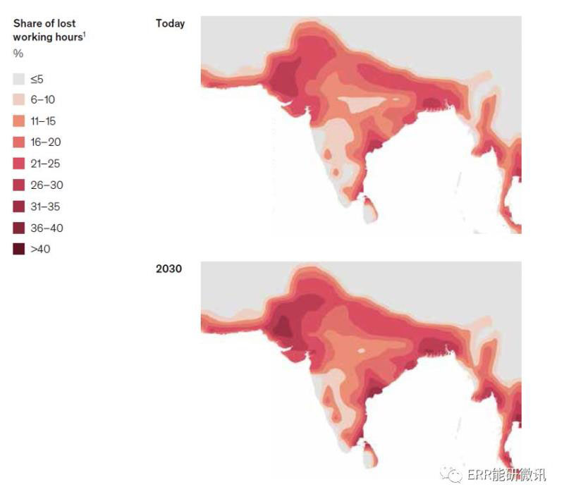 戶外勞動生產(chǎn)率預(yù)計也會下降,從而減少可以在戶外工作的有效小時數(shù)。截至2017年,在印度,高溫作業(yè)產(chǎn)生了約50%的GDP,推動了約30%的GDP增長,雇傭了約75%的勞動力,約3.8億人。到2030年,根據(jù)我們的估計,印度的平均白天工作時間損失可能會增加到每年占GDP的2.5~4.5%之間。