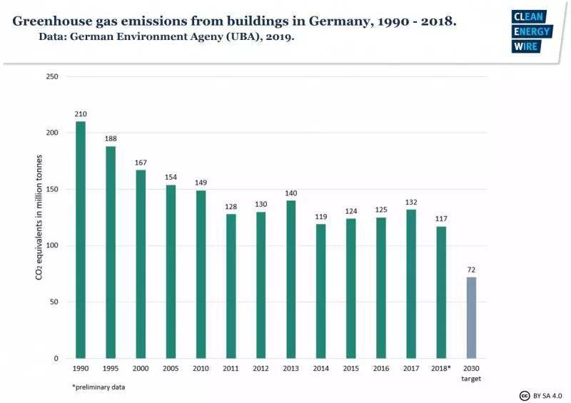 由于德國2200萬棟建筑物中超過90%是用石油和天然氣作為燃料的,因此該行業(yè)的排放非常高。德國政府的目標(biāo)是到2050年實(shí)現(xiàn)“近零排放的建筑”。但是,盡管建筑部門碳排放量自1990年以來下降了44%,但自2011年以來基本上停滯不前。節(jié)能建筑對于供暖轉(zhuǎn)型至關(guān)重要,經(jīng)濟(jì)部估計(jì)到2020年代中期,德國1900萬棟居民住宅中約有一半需要翻新,目標(biāo)是每年實(shí)現(xiàn)2%的翻新改造速度,但目前約為所需速度的一半。原因是這些數(shù)以百萬計(jì)的建筑物有數(shù)以百萬計(jì)的所有者,獲得他們的同意以接受更嚴(yán)格的排放政策和激勵措施是政治上的“老大難”。