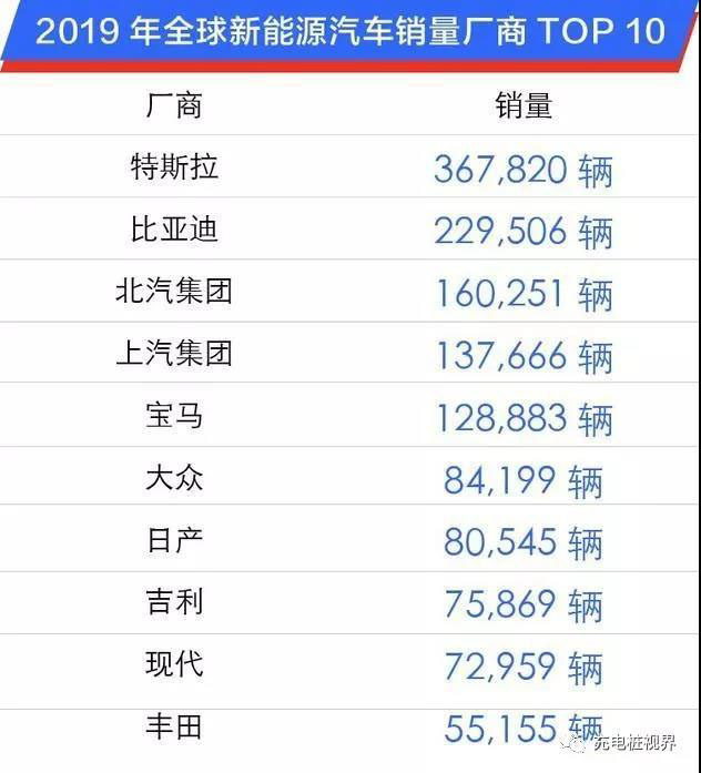 說(shuō)完了車型,我們?cè)賮?lái)看看廠商的銷量數(shù)據(jù)。根據(jù)數(shù)據(jù)顯示,在2019年特斯拉憑借367,820臺(tái)的銷量獲得了冠軍,比亞迪以229,506臺(tái)的成績(jī)位列第二,北汽新能源排在第三名,在2019年銷售了160,251臺(tái)。另外在前十名中還有寶馬、上汽、大眾、日產(chǎn)、吉利、現(xiàn)代和豐田。