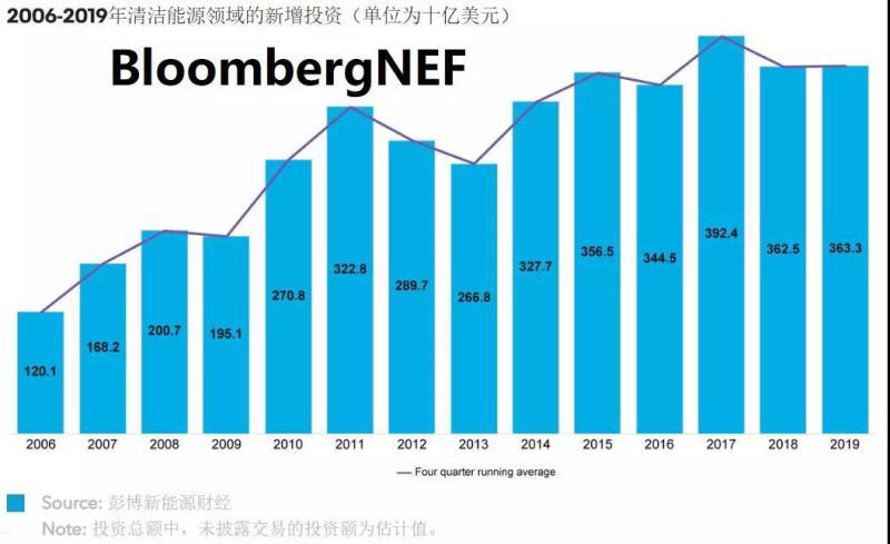 2019年,廣泛的清潔能源投資總額達(dá)3,633億美元,其中包括研發(fā)資金以及從公開市場(chǎng)、風(fēng)險(xiǎn)投資和私募股權(quán)交易進(jìn)入專業(yè)企業(yè)的資金,略高于上年更新后的投資總額3,625億。