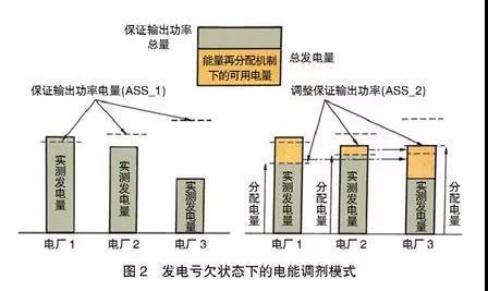 各個電廠的有效出力,由巴西國家電力調(diào)度中心根據(jù)負荷需求與水文狀況綜合決定。利用MRE機制進行電能分攤的基本原則是用超發(fā)電電廠超發(fā)出力補足欠發(fā)電電廠保證出力的缺額,如圖1所示。