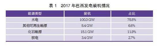 目前,巴西電源結(jié)構(gòu)以水電為主。截至2017年5月,全國近80%的電力需求由水力發(fā)電供給,其中大型水電發(fā)電裝機為8600萬千瓦,共計158座在運水電站,另有9座在建和26座計劃建設(shè)。2017年巴西發(fā)電裝機情況如表 1所示。