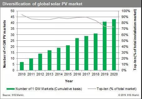在可預(yù)見的將來,像中國(guó)這樣的大型市場(chǎng)仍將繼續(xù)占領(lǐng)全球裝機(jī)的很大份額。但隨著其他地方產(chǎn)能增加,未來幾年全球太陽能裝機(jī)增長(zhǎng)對(duì)中國(guó)市場(chǎng)的依賴將持續(xù)減少除中國(guó)以外的全球領(lǐng)先市場(chǎng)的安裝量在2019年增長(zhǎng)了53%,預(yù)計(jì)到2020年將繼續(xù)保持兩位數(shù)的增長(zhǎng)。總體而言,前十大太陽能市場(chǎng)的總體市場(chǎng)份額預(yù)計(jì)將下降至從2010年的94%降至73%。