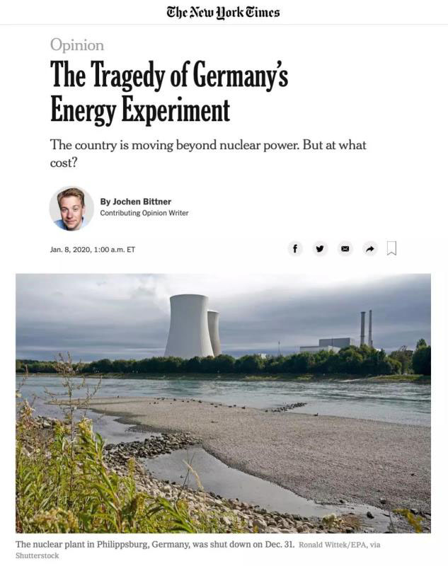 美國(guó)《紐約時(shí)報(bào)》發(fā)表署名Jochen Bittner的專欄文章評(píng)述德國(guó)的能源轉(zhuǎn)型,題目是:The Tragedy of Germany’s Energy Experiment(德國(guó)能源實(shí)驗(yàn)的悲?。€有一個(gè)副標(biāo)題:The country is moving beyond nuclear power. But at what cost?(德國(guó)放棄核能,但是成本有多大?)