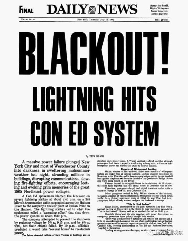當(dāng)年的報紙標(biāo)題《大停電!閃電擊中聯(lián)合愛迪生供電系統(tǒng)》
