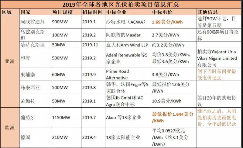 從全球可再生能源市場分析,毫無疑問的,亞洲市場占據(jù)主要地位,尤其是印度,每個季度均有數(shù)個GW級以上的項目招標,由于各種因素,最終流拍或撤銷的項目也不在少數(shù)。在2019年的最后一個月,印度還啟動了總計2.4GW的項目招標(詳見《印度啟動1.2GW光伏+1.2GW風光互補項目招標》),但是由于宗教改革引發(fā)的暴亂,有可能會對這一進程造成影響。沙特阿拉伯和阿聯(lián)酋的幾個大項目最終成交的投標電價,一度刷新了人們對大型光伏電站的投資認知,泰國,馬來西亞,柬埔寨,新加坡等推出了一系列中小型光伏電站的競標項目,并大力發(fā)展水面光伏。不出意外,未來幾年,東南亞地區(qū)的水面電站將如雨后春筍般冒出。日本和韓國的光伏電站競拍與其他市場的拍賣類型不同,有政府主導的電力補貼FIT,因此中標電價在此不做討論。