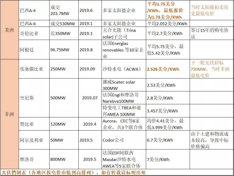 除此之外,來自中國的天合光能,特變電工,中能建等企業(yè)也都有中標一些大型電站項目,印度的Adani,挪威的Scatec在今年不僅參與光伏項目投標,還分別取得了與組件巨頭簽訂長期采購組件協(xié)議,接受財團增資等重大業(yè)務(wù)進展。接來下我們以各大洲為區(qū)域劃分,分析今年的光伏投標概況。