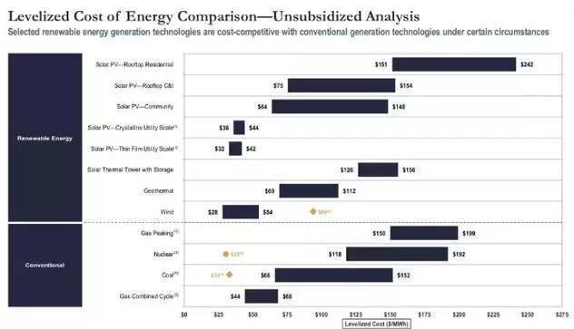 在不考慮聯(lián)邦政府稅收優(yōu)惠的情況下,美國各類能源發(fā)電平準(zhǔn)化成本的區(qū)間如下: