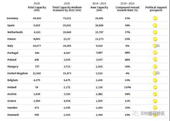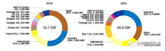 2019年和2023年歐盟28國中排名前10的太陽能光伏市場