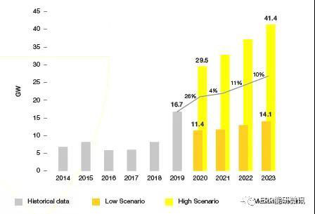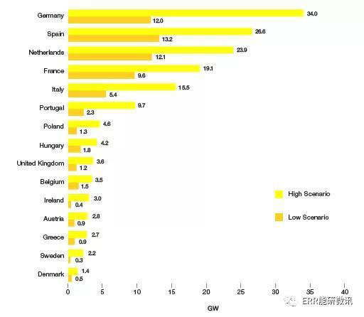 2019~2023年歐盟28國高、低情境下太陽能光伏的新增裝機(jī)容量