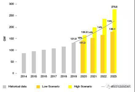 預(yù)計(jì)到2023年,歐盟太陽能光伏市場將繼續(xù)增長。在2019年需求增長超過一倍之后,我們預(yù)計(jì)2020年將同比增長26%,超過20GW的水平,達(dá)到21GW。到2021年,新增裝機(jī)預(yù)計(jì)將達(dá)到21.9GW,接近歐盟太陽能安裝的創(chuàng)歷史新高,2011年達(dá)到22.2GW。這一紀(jì)錄預(yù)計(jì)將在2022年打破,即超過24.3GW,并在2023年再次打破(新增太陽能裝機(jī)容量26.8GW)。我們對(duì)歐盟太陽能市場的"天氣預(yù)報(bào)"仍然是“晴朗而陽光明媚,地平線上云層很少,前方?jīng)]有降雨”。