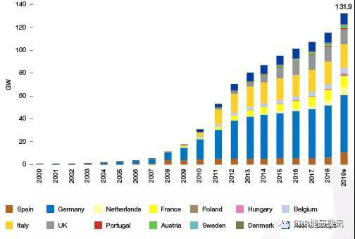 隨著歐盟對(duì)太陽能發(fā)展支持的擴(kuò)大,到2019年底,歐盟太陽能累計(jì)裝機(jī)容量達(dá)到131.9GW,同比增加14%(上一年底累計(jì)裝機(jī)容量為115.2GW)。