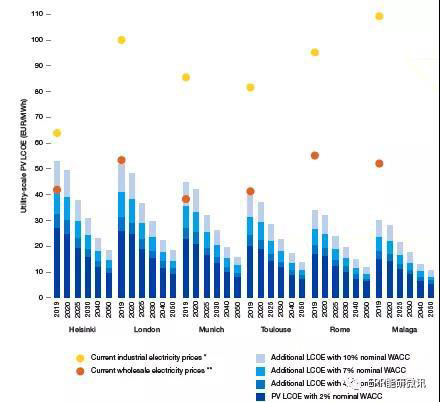 2019~2050年,歐洲6個(gè)不同地點(diǎn)太陽能光伏的平準(zhǔn)化度電成本(LCOE)
