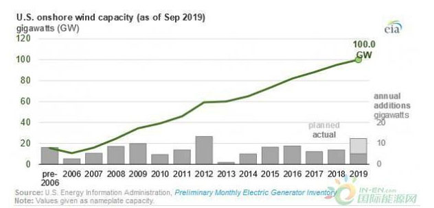 近日,美國能源信息署(EIA)月度發(fā)電報告(Preliminary Monthly Electric Generator Inventory)數(shù)據(jù)顯示,截至2019年9月底,美國累計陸上風電裝機量超100GW。