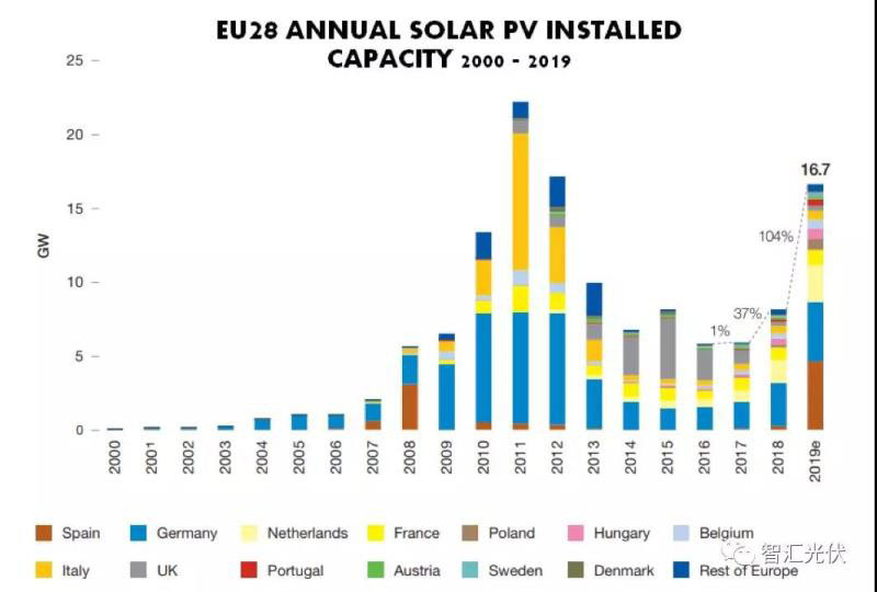 2019年,在中國(guó)國(guó)內(nèi)前三季度光伏裝機(jī)大幅下降50%的同時(shí),歐洲的光伏市場(chǎng)卻出現(xiàn)104%的增長(zhǎng)!