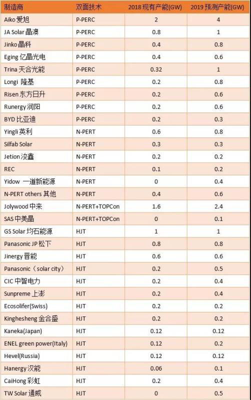 附雙面組件產(chǎn)能規(guī)劃與預(yù)測(cè)表: