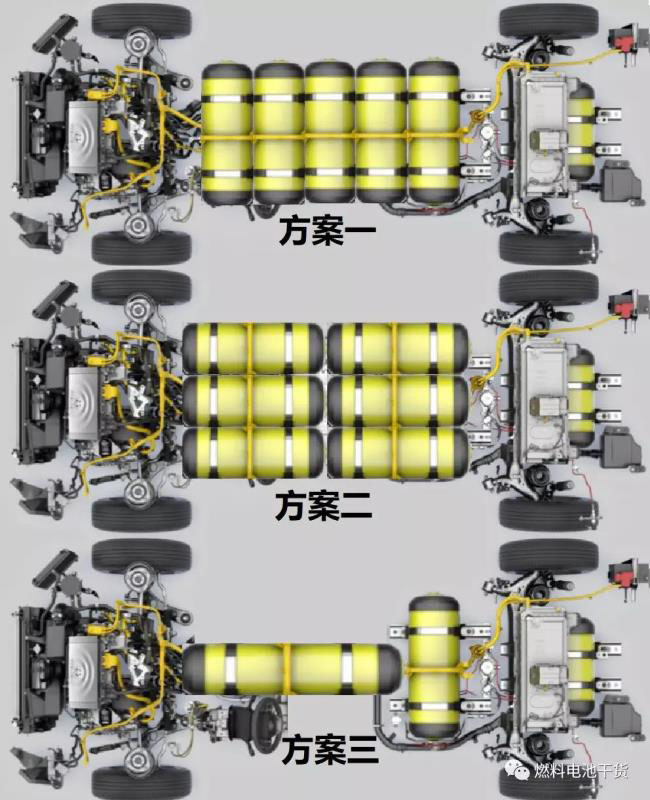 車載氫瓶體積和容量是關(guān)系燃料電池續(xù)航里程的最重要因素。參考燃料電池巴士頂部多組氫瓶排列組合、電動(dòng)車鋰電池組底盤平鋪方案和思路,單純從提高燃料電池汽車?yán)m(xù)航角度出發(fā),氫瓶底盤布置方案無疑是最佳選項(xiàng)。底盤的大面積為燃料電池氫瓶的布置提供了廣袤空間?;诶卓怂_斯LS平臺(tái)打造的豐田第二代Mirai燃料電池汽車將大小兩個(gè)氫瓶垂直布置在底盤,縱向氫瓶取代了雷克薩斯LS平臺(tái)汽車上的傳動(dòng)軸,氫氣搭載量的提升使得第二代Mirai續(xù)航里程增加30%。