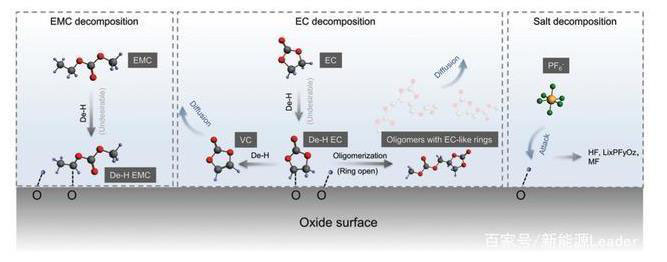 作者認(rèn)為EMC和EC溶劑在NCM正極材料表面的分解機(jī)理如下圖所示,其中EMC能夠脫出一個(gè)b位的H原子,然后通過(guò)C-O鍵吸附正極材料的表面。EC也通常會(huì)在正極表面發(fā)生脫H反應(yīng),生成脫去一個(gè)H原子的EC,并吸附在正極材料的表面。隨著脫Li的進(jìn)行,溶劑在正極表面的分解的驅(qū)動(dòng)力在持續(xù)提升,因此EC還會(huì)進(jìn)一步脫除一個(gè)H原子,生成VC。同時(shí)EC也可能發(fā)生開(kāi)環(huán),生成一些低聚物,例如C6H8O6、C9H14O8、C7H10O6等,這些溶劑的脫H產(chǎn)物最終可能會(huì)被氧化位CO和CO2。溶劑分解會(huì)在正極表面產(chǎn)生一層惰性層,導(dǎo)致NCM正極材料的電荷交換阻抗的增加。同時(shí)這些反應(yīng)還會(huì)生成質(zhì)子,從而引起LiPF6的分解,產(chǎn)生HF、LixPFyOz和PF3O等產(chǎn)物,影響鋰離子電池的循環(huán)穩(wěn)定性。