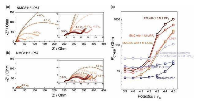 從下圖c可以看到NCM111、Al2O3包覆NCM622和采用高濃度電解液的NCM811材料在充電到4.8V的過(guò)程僅出現(xiàn)了輕微的電荷交換阻抗增加現(xiàn)象,