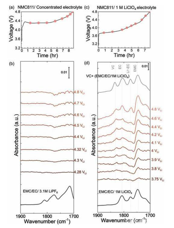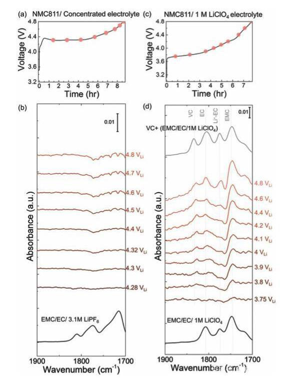 近日,麻省理工的Yirui Zhang(第一作者、通訊作者)和Yang Shao-Horn(通訊作者)等人開(kāi)發(fā)了一種原位的紅外吸收的方法對(duì)碳酸酯類電解液在NCM正極表面發(fā)生分解的過(guò)程進(jìn)行了分析。研究表明,盡管EC在Pt電極的表面的抗氧化電位可達(dá)4.8V,但是在NCM811表面時(shí)3.8V以上就開(kāi)始發(fā)生氧化分解。