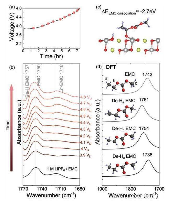 如果電解液中不存在EC,EMC是否也會(huì)在正極表面發(fā)生分解?作者對(duì)1M LiPF6的EMC溶液進(jìn)行了測(cè)試,隨著電壓的升高,我們能夠看到EMC也開(kāi)始在正極表面發(fā)生分解(如下圖a所示)。在非原位紅外測(cè)試中我們能夠在1750和1718/cm處觀察到C=O鍵的吸收峰,對(duì)應(yīng)的為EMC和與Li+結(jié)合后的EMC。同樣的我們?cè)赑t電極上,電壓達(dá)到4.8V也未觀察到EMC的分解,這與密度函數(shù)理論的計(jì)算結(jié)果是一致的。但是在NCM811材料的表面,1750/cm處的吸收峰隨著電壓的升高向著更高的波數(shù)偏移(如下圖b所示),表明EMC發(fā)生脫氫反應(yīng),作者認(rèn)為這是一個(gè)b位的H被脫去,而形成一個(gè)C-O鍵。