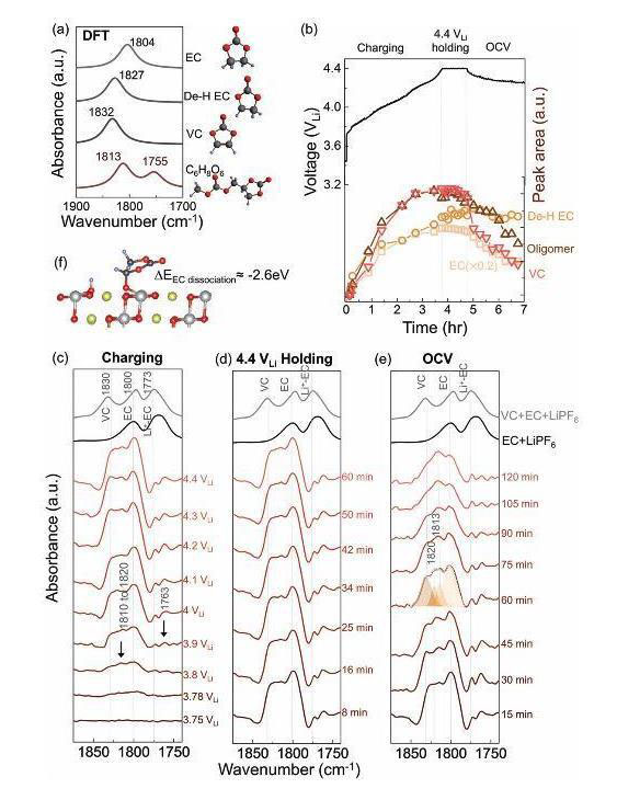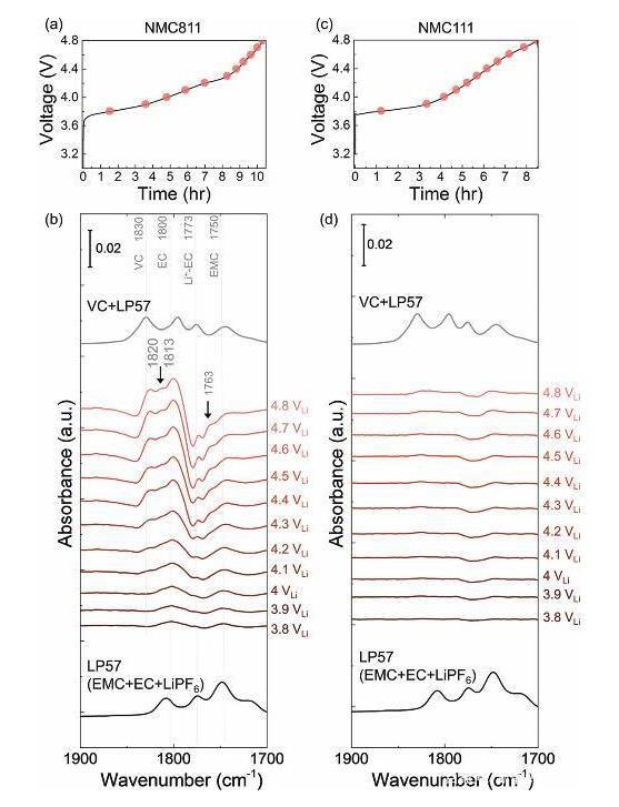 在下圖d所示的4.4V恒壓測(cè)試中,多數(shù)吸收峰隨著恒壓時(shí)間的增加而出現(xiàn)了一定程度的降低,在恒壓過(guò)程中VC(1830/cm)、低聚物(1820/cm)和EC(1800/cm)分子的強(qiáng)度都在降低,表明這些物質(zhì)能夠從NCM811的表面擴(kuò)散到電解液之中,而脫一個(gè)H原子的EC(1813/cm)分子的吸收峰沒(méi)有出現(xiàn)明顯的變化,表明該分子通過(guò)C-O鍵固定在NCM811材料的表面。