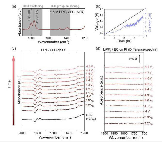 在紅外吸收光譜中C=O鍵的信號(hào)最強(qiáng),同時(shí)也是溶劑分子中對(duì)分子結(jié)構(gòu)變化最為敏感的鍵,因此在該項(xiàng)研究中作者也將研究的重點(diǎn)聚焦于溶劑分子中的C=O鍵。在紅外圖譜中C=O鍵在1900-1700/cm范圍內(nèi)有兩個(gè)顯著的特征峰(如下圖c所示),分別對(duì)應(yīng)的為C=O鍵在EC中時(shí)的1800/cm附近的吸收峰,以及EC與Li+結(jié)合后的1773/cm處的特征峰。從下圖c中EC溶劑在Pt電極上不同電位的紅外圖譜中可以看到,Pt電極的電位一直升高至4.8V,EC溶劑也沒(méi)有出現(xiàn)新的特征峰,表明EC在Pt電極上在4.8V以下沒(méi)有明顯的分解。