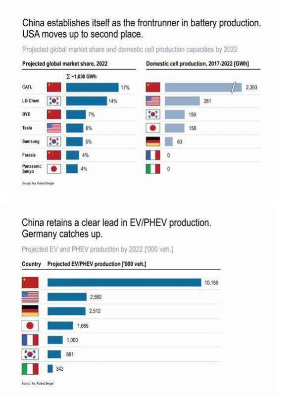 根據(jù)調查報告,中國在動力電池生產(chǎn)領域世界第一,中國的領先優(yōu)勢明顯與別國拉大。資深顧問Alexander Busse分析:“其他國家都沒有大規(guī)模擴建本國動力電池生產(chǎn)的計劃”,“中國預計2017年到2022年期間的電池生產(chǎn)量將是2016年到2021年期間的十倍”。電池方面,歐洲國家正在逐步被中國、美國、韓國和日本甩在身后。