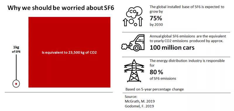 開關(guān)設(shè)備是電網(wǎng)的重要組成部分,用于隔離并保護(hù)電網(wǎng)的不同部分。開關(guān)設(shè)備技術(shù)已經(jīng)越來越普及,氣體絕緣開關(guān)設(shè)備(GIS)被認(rèn)為是先進(jìn)技術(shù)。但是,這項(xiàng)技術(shù)所含的氣體正是世界上最強(qiáng)的溫室氣體——六氟化硫(SF6),其單分子的溫室效應(yīng)是二氧化碳的2.2萬倍。全球SF6中有80%被用作GIS的絕緣介質(zhì),其全球年排放量為約8,100噸,這相當(dāng)于約1億輛新車每年產(chǎn)生的二氧化碳排放量。此外,SF6大氣壽命至少為1000年。