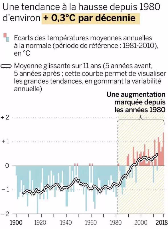 世界氣象組織發(fā)布報(bào)告,2019年1月至10月期間的全球平均氣溫溫度與工業(yè)前時(shí)期相比,上升1.1℃。世界氣象組織指出,“面對(duì)全球變暖,我們沒有時(shí)間了”,1980年以來,每10年上升0.3°C,2010-2019年“幾乎肯定”是歷史上最熱的10年。按目前的趨勢(shì),到本世紀(jì)末氣溫可能會(huì)上升到4°C或5°C。即使各國履行其目前在2015年的《巴黎協(xié)定》下的承諾,全球平均氣溫升幅也將超過3°C,控制溫升不超過1.5-2°C的目標(biāo)難以實(shí)現(xiàn)。
