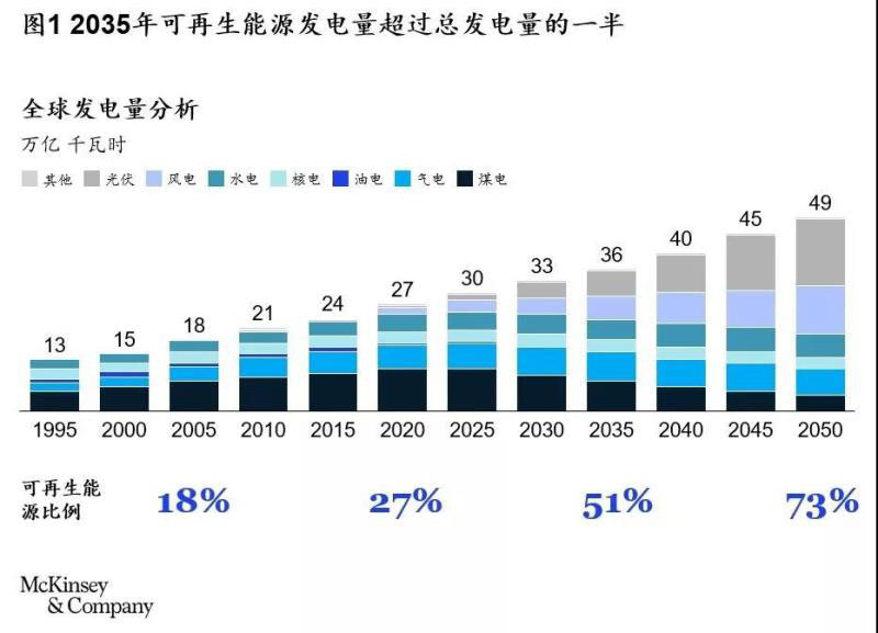隨著行業(yè)供應(yīng)鏈日趨成熟,儲能成本大幅下降,早期對可再生能源發(fā)展高成本及電力供應(yīng)不穩(wěn)定等的擔憂逐步平息。以北美地區(qū)為例,從2012到2018年,陸上風電發(fā)電成本由0.072美元/千瓦時降至今日的0.042美元/千瓦時;電池成本也從2013年的650美元/千瓦時下降到了2018年的176美元/千瓦時。麥肯錫預測,未來可再生能源需求有望大幅提升,發(fā)電量占比將從今日的25%飛速提升至2035年的51% (見圖1)。