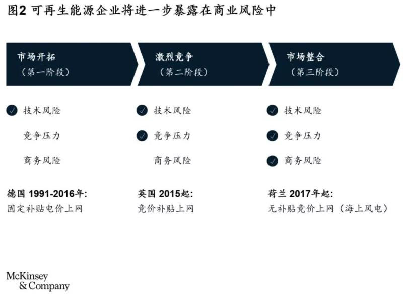 市場環(huán)境也日趨復雜。電網(wǎng)的要求日益增高,可再生能源公司需承擔起平衡電網(wǎng)系統(tǒng)的責任,如按需峰谷減產(chǎn),增加站點儲能能力等。除此之外,可再生能源補貼政策和購電協(xié)議(PPA)的收入份額下降,項目商業(yè)條款更加嚴格等,也會讓可再生能源公司面臨更多潛在風險(見圖2)。在這個快速發(fā)展的行業(yè)中,什么才是成功的關(guān)鍵,什么樣的玩家才能獲勝呢?