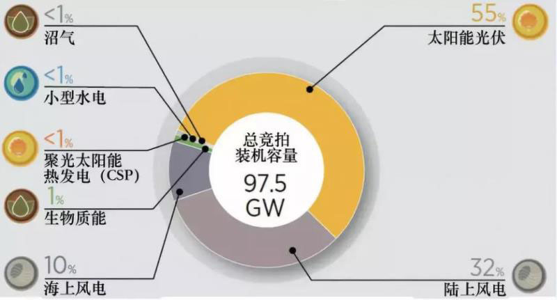 圖片:2017-2018年,可再生能源發(fā)電裝機(jī)的競(jìng)拍規(guī)模約為97.5GW。其中,太陽(yáng)能光伏的占比超過(guò)一半,陸上風(fēng)電約占1/3