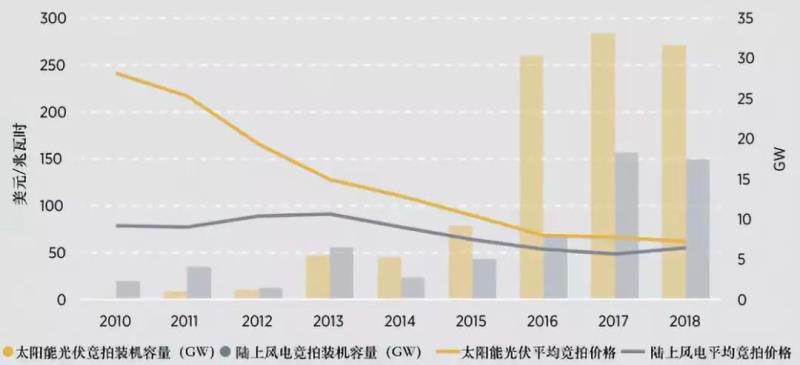 圖片:2010-2018年全球太陽(yáng)能光伏與陸上風(fēng)電的競(jìng)拍裝機(jī)容量和平均競(jìng)拍價(jià)格
