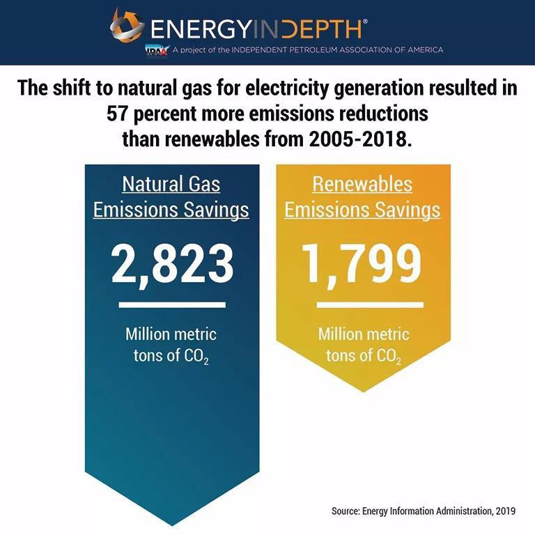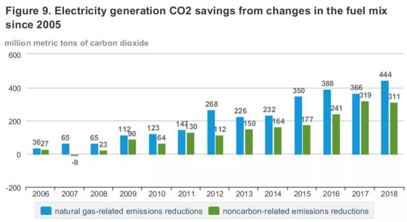根據(jù)美國能源信息署(EIA)的統(tǒng)計數(shù)據(jù),在2005年至2018年之間,美國二氧化碳累計減少量總計為46.21億噸,具體歸因于從煤炭向天然氣和可再生能源發(fā)電的轉(zhuǎn)型。其中,天然氣替代煤電減排量28.23億噸,可再生能源發(fā)電減排17.99億噸。2018年天然氣發(fā)電減排量4.44億噸,可再生能源發(fā)電減排3.11億噸。