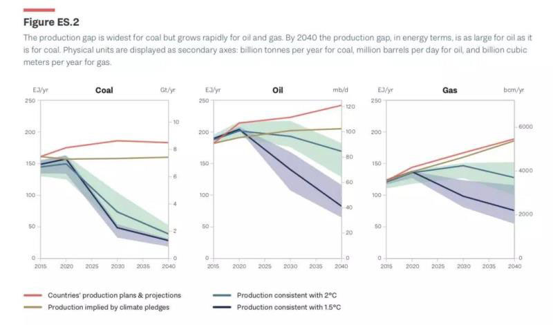 ——在化石燃料中超產(chǎn)最大的是煤炭,到2030年各國計(jì)劃生產(chǎn)的煤炭量將比2°C要求高出150%(52億噸),比1.5°C要求高出280%(64億噸)。相對(duì)于1.5°C溫升要求,石油生產(chǎn)超出59%或4200萬桶/天;天然氣超出70%或2萬億立方米。