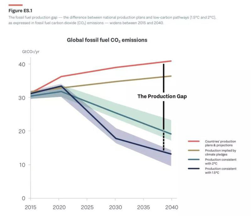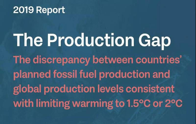 聯(lián)合國開發(fā)計(jì)劃署、瑞典環(huán)境研究所日前發(fā)布2019年P(guān)roduction Gap(化石能源超產(chǎn))報(bào)告,評(píng)估了全球各國政府化石燃料生產(chǎn)計(jì)劃與巴黎氣候協(xié)定的全球生產(chǎn)水平(與1.5°C和2°C路徑一致)之間的差異。報(bào)告結(jié)論是各國政府計(jì)劃到2030年的化石燃料的生產(chǎn)量比2°C溫升控制水平高出約50%,比1.5°C溫升控制水平高出120%。