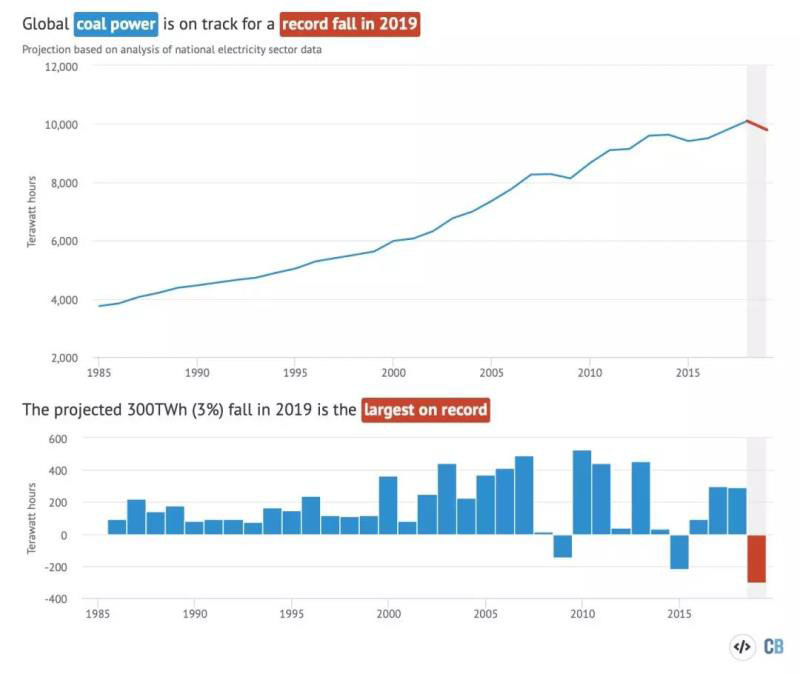 根據(jù)CarbonBrief發(fā)表報(bào)告,基于2019年前10個(gè)月來(lái)自世界各國(guó)的每月電力部門(mén)數(shù)據(jù),全球煤炭發(fā)電量有望在2019年下降3%左右(將減少約300太瓦時(shí),TWh),超過(guò)去年德國(guó)、西班牙和英國(guó)的煤電總產(chǎn)量,創(chuàng)歷史上最高跌幅。