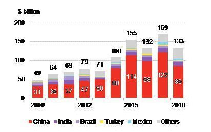 然而,投資額的減少并不僅限于中國。印度和巴西清潔能源項目獲得的資金較上年分別下降了24億美元和27億美元。縱觀報告覆蓋的所有新興市場,2018年總投資降至1330億美元,不僅低于2017年,也低于2015年的數(shù)字??傮w而言,太陽能和風(fēng)電成本的降低是新興經(jīng)濟(jì)體投資額絕對值減少的重要因素。