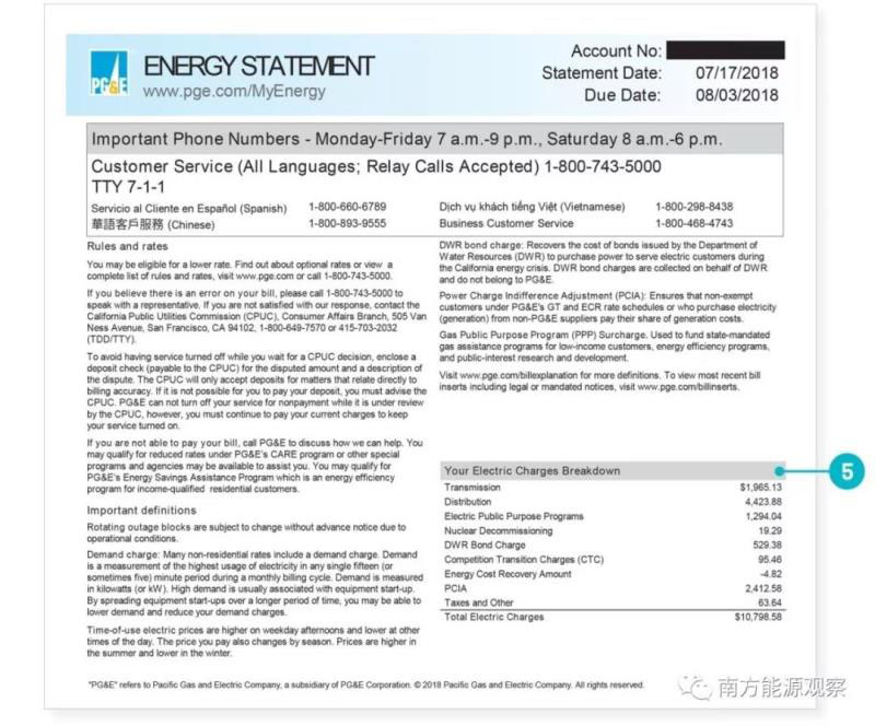 這份賬單包含了以下幾個部分:首先是按照套餐計劃付給零售商的費用;其次是支付給PG&E的輸電配電費用(該費用受到加州公用事業(yè)委員會監(jiān)管,收費標(biāo)準(zhǔn)規(guī)定得很詳細(xì),用戶可以隨時對這些文件進行查閱);其余的是核電退役、電力公共項目費、競爭性轉(zhuǎn)換費、公用供水公司債券費用、繳納稅制等其他費用。賬單對于電力輸送費用和套餐計劃也有十分詳細(xì)的解釋明細(xì)。