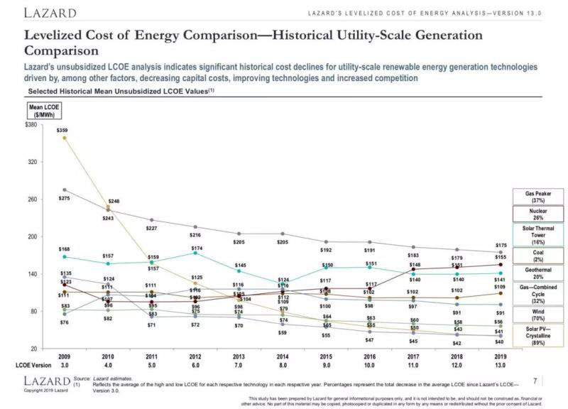 陸上風(fēng)電:下降70%(2009年135美元/兆瓦時(shí),2019年41美元/兆瓦時(shí))