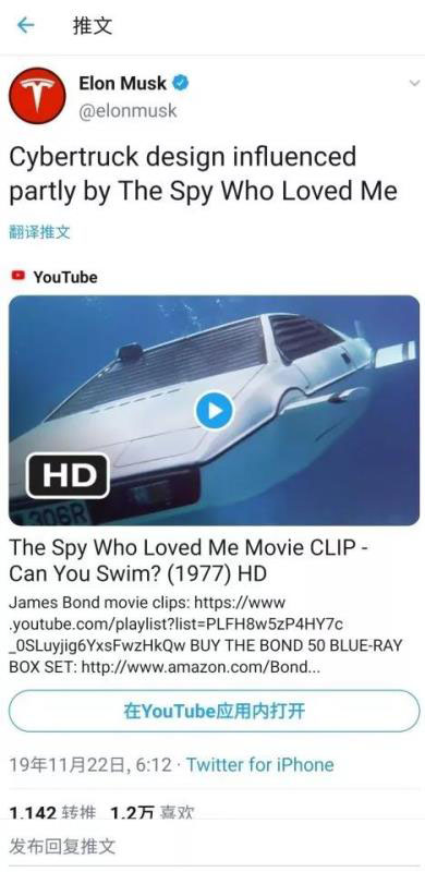 特斯拉首席執(zhí)行官埃隆·馬斯克在發(fā)布會上表示,皮卡發(fā)展了100多年,完全是一個模樣,特斯拉要造極其“與眾不同”的皮卡。而Cybertruck的外觀設計靈感正來自于1977年上映的《007之海底城》(The Spy Who Loved Me)電影中詹姆斯·邦德駕駛的超級蓮花跑車Lotus S1 Esprit,顯得格外與眾不同。