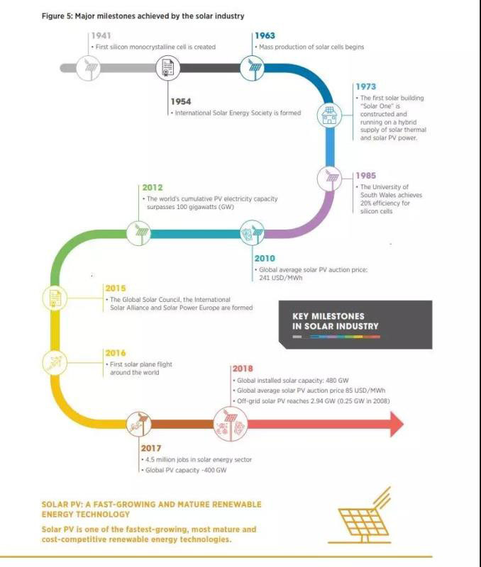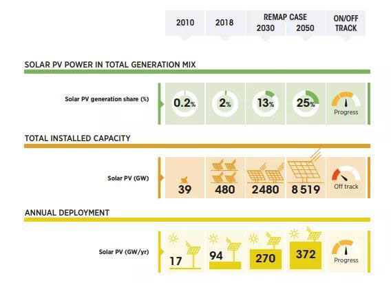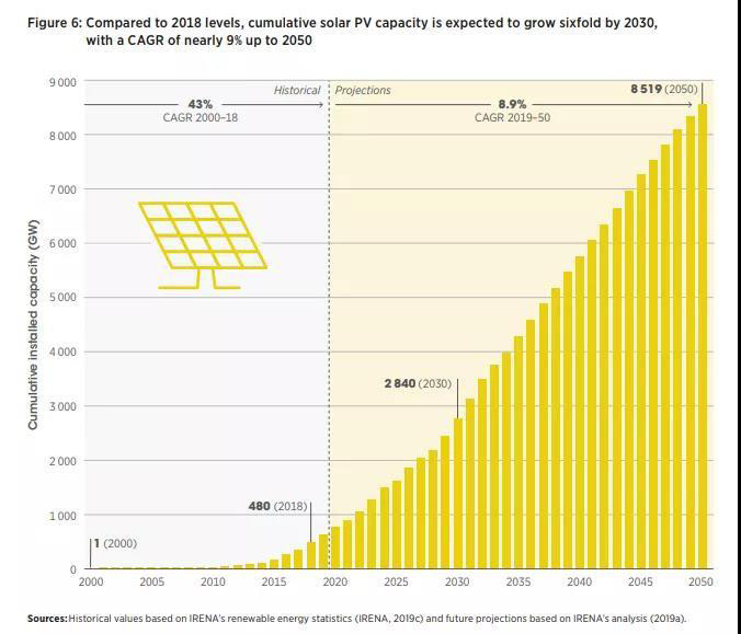 本周二(11月12日),在秘魯首都利馬舉行的2019年世界太陽(yáng)能大會(huì)上,可再生能源機(jī)構(gòu)IRENA發(fā)布新的分析報(bào)告《光伏的未來》,敦促各國(guó)政府降低政策、經(jīng)濟(jì)、監(jiān)管和技術(shù)壁壘,使全球太陽(yáng)能裝機(jī)量在2018年達(dá)到480GW,2030年達(dá)到2.84TW,2050年達(dá)到8.5TW(8500GW),全球才有機(jī)會(huì)抵御最嚴(yán)重的全球性氣候變暖問題。