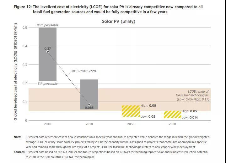 光伏技術(shù)的不斷提高是光伏成為廉價(jià)能源的重要推動(dòng)力。通過對(duì)全球光伏項(xiàng)目拍賣中標(biāo)價(jià)格整理追蹤表明,明年太陽(yáng)能發(fā)電的平均價(jià)格將達(dá)到0.048美元/千瓦時(shí),相比2018年的光伏發(fā)電成本低44%。報(bào)告中稱,“最近在阿布扎比,智利,迪拜,墨西哥,秘魯和沙特阿拉伯地區(qū)太陽(yáng)能光伏的拍賣價(jià)格創(chuàng)歷史新低,這表明在全球范圍內(nèi),LCOE(電力平準(zhǔn)化成本)為0.03美元/千瓦時(shí)是可能的”。