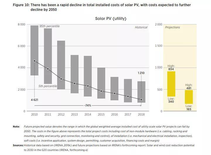 報(bào)告預(yù)測(cè),太陽(yáng)能項(xiàng)目開發(fā)成本每千瓦裝機(jī)成本從去年的1,210美元降至2030年的340-834美元,到2050年,再降至165-481美元。太陽(yáng)能電價(jià)預(yù)計(jì)也將從去年的平均0.085美元/千瓦時(shí)降至2030年的0.02-0.08美元 / kWh,再到2050年達(dá)到0.01-0.05美元 / kWh。