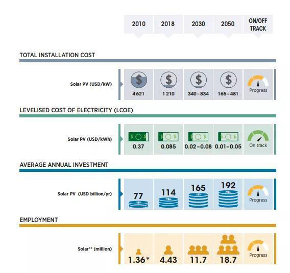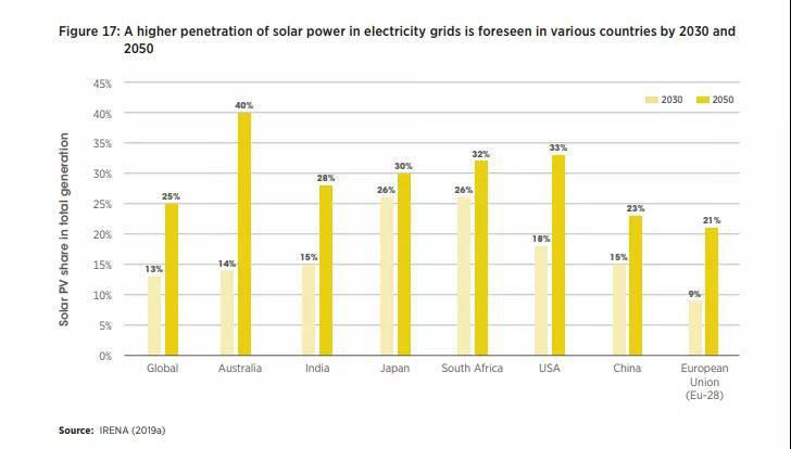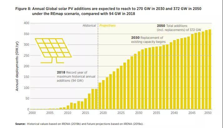 而若要達(dá)到2050年全球裝機(jī)8.519TW的目標(biāo),就需要將太陽(yáng)能年新增裝機(jī)速度從2018年的94GW提高到到2050年的每年372GW。屆時(shí)太陽(yáng)能裝機(jī)量將從2018年的2%增長(zhǎng)到2030年的13%再到2050年的25%。