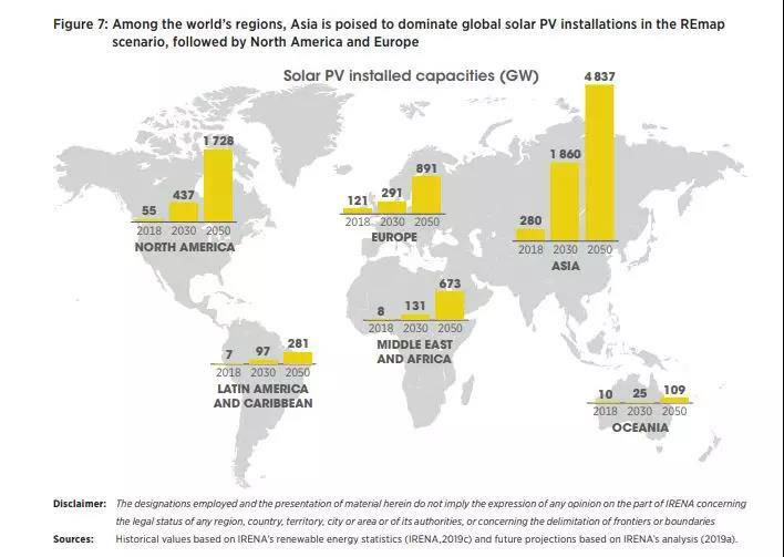 到2050年,建立巨大而完善的光伏系統(tǒng)生態(tài)系統(tǒng)目標(biāo)將由亞洲主導(dǎo)完成,同時(shí)非洲大陸將成為裝機(jī)量主力軍,占8.519TW市場(chǎng)一半以上的量,北美占20%,歐洲則低于10%。未來,最有潛力的光伏裝機(jī)量市場(chǎng)應(yīng)為拉丁美洲和加勒比海地區(qū),預(yù)計(jì)到2050年,該地區(qū)光伏裝機(jī)量將從今天的7GW增長(zhǎng)到280GW,以40倍的增長(zhǎng)速率。
